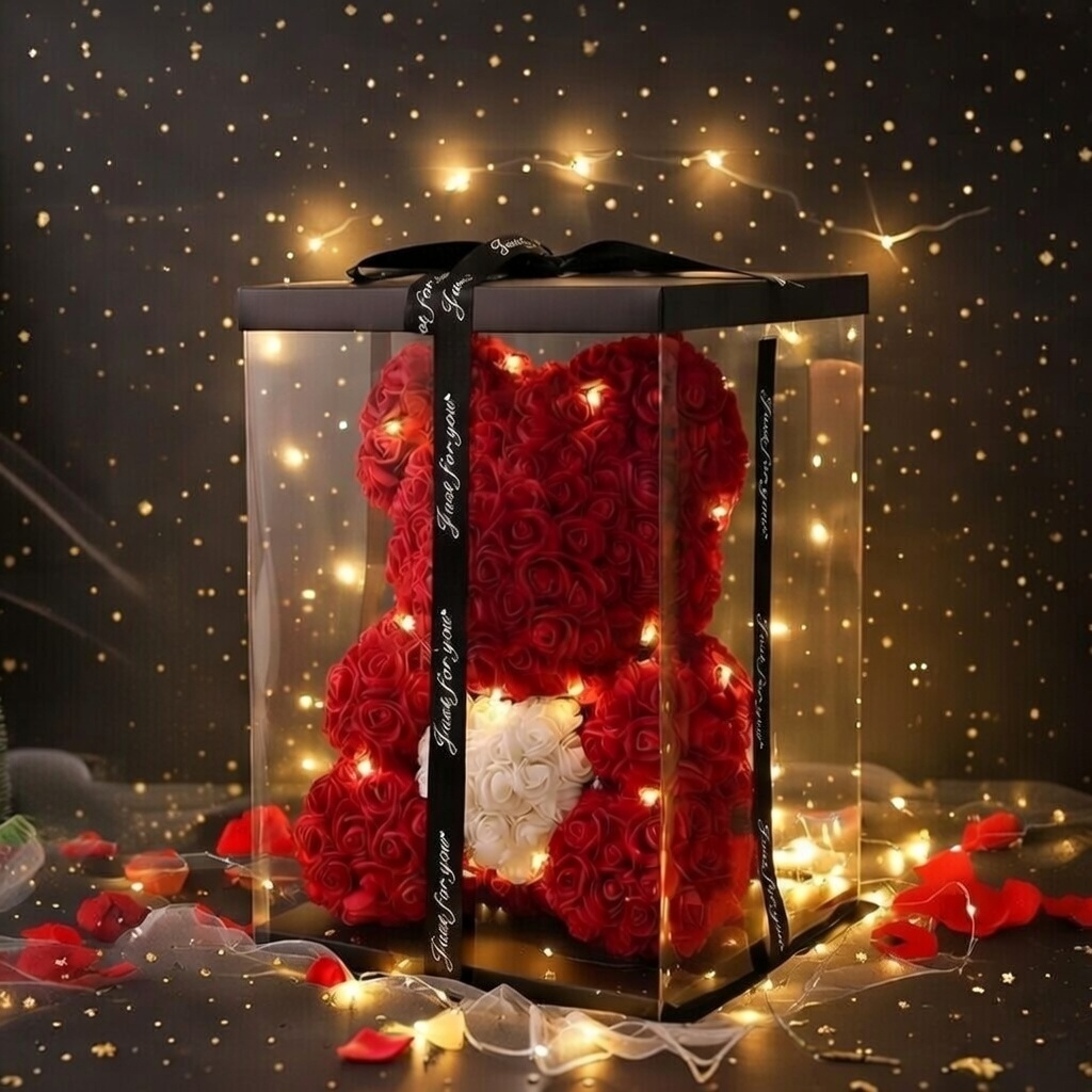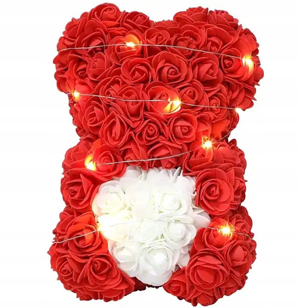 Miś z Płatków Róż Czerwony LED – Elegancki Prezent na Walentynki